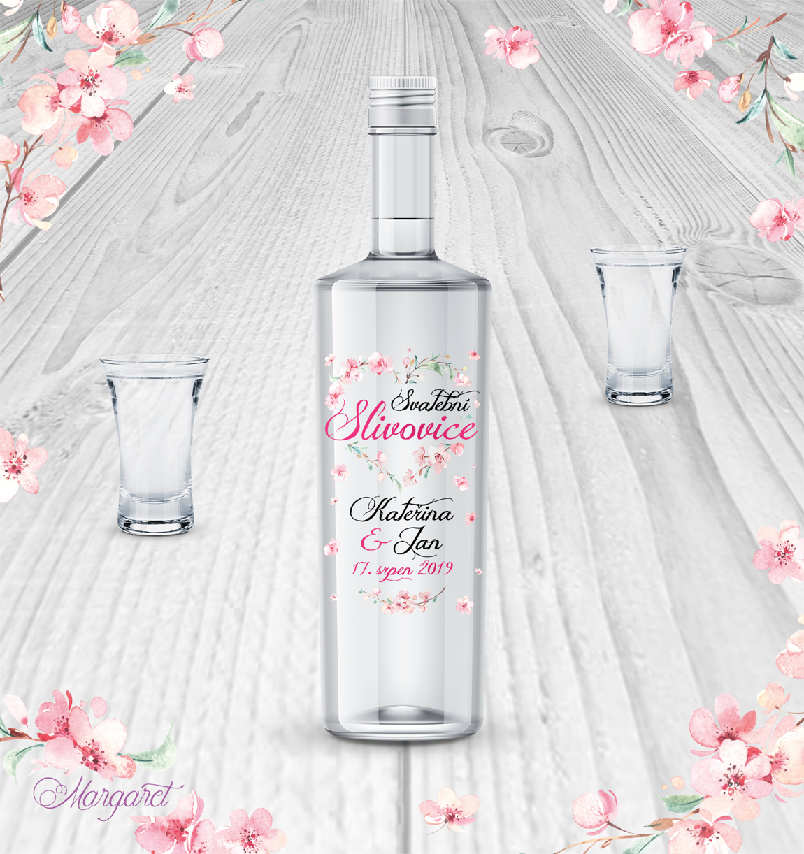 Luxusní průhledná etiketa na slivovici. Pálenka, kořalka nebo slivovice bývá nedílnou součástí svatby. Naše etikety jsou navržené, aby se hodily skvěle do stylu Vaší svatby, s Vašimi jmény a datem svatby.