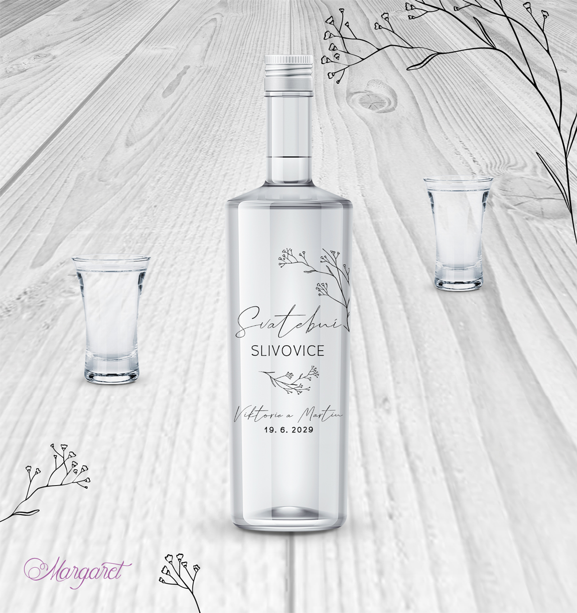 Luxusní průhledná etiketa na slivovici. Pálenka, kořalka nebo slivovice bývá nedílnou součástí svatby. Naše etikety jsou navržené, aby se hodily skvěle do stylu Vaší svatby, s Vašimi jmény a datem svatby.