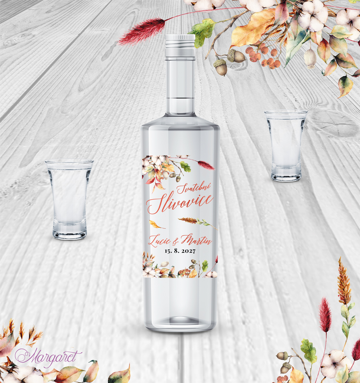 Luxusní průhledná etiketa na slivovici. Pálenka, kořalka nebo slivovice bývá nedílnou součástí svatby. Naše etikety jsou navržené, aby se hodily skvěle do stylu Vaší svatby, s Vašimi jmény a datem svatby.