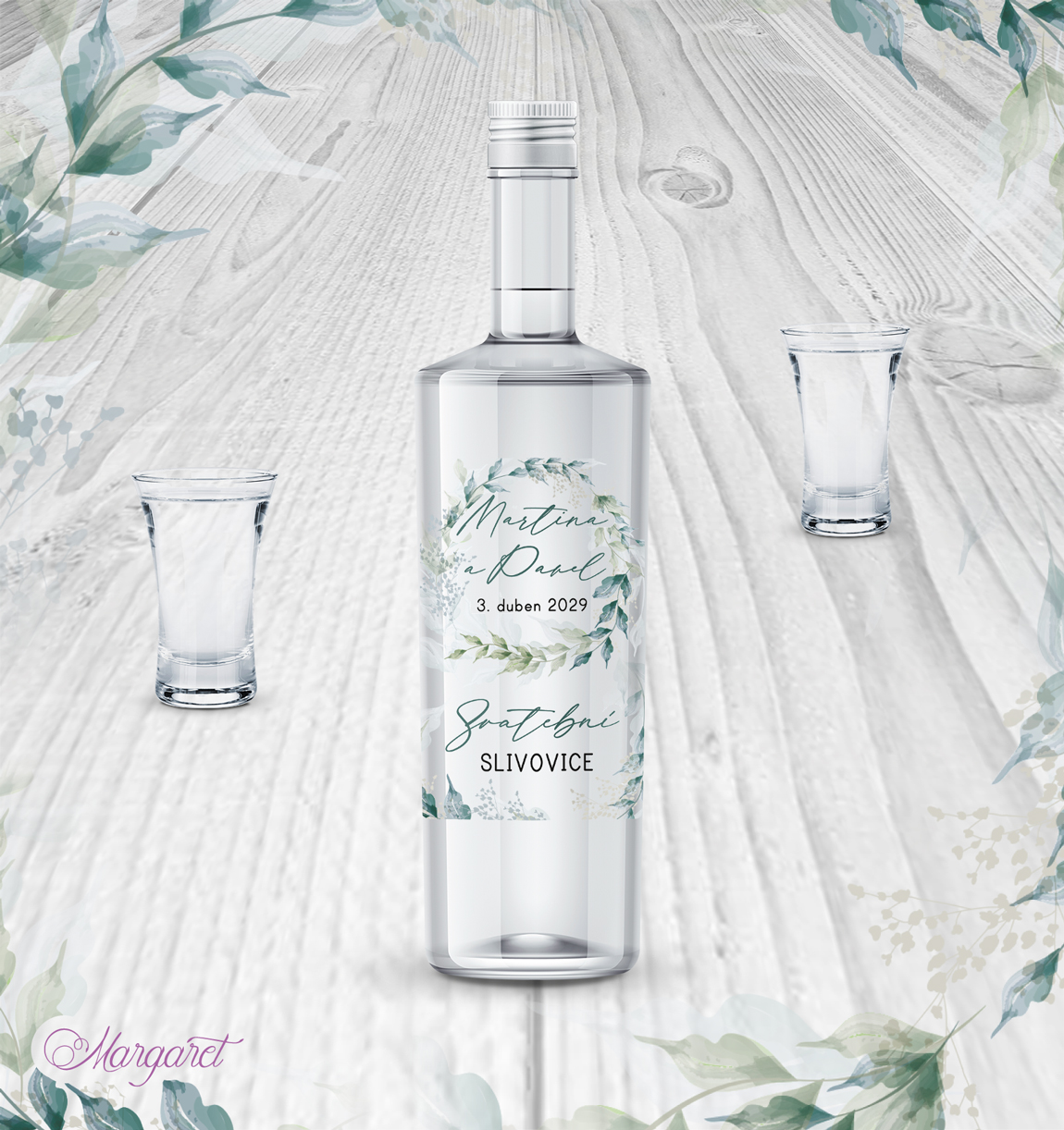 Luxusní průhledná etiketa na slivovici. Pálenka, kořalka nebo slivovice bývá nedílnou součástí svatby. Naše etikety jsou navržené, aby se hodily skvěle do stylu Vaší svatby, s Vašimi jmény a datem svatby.
