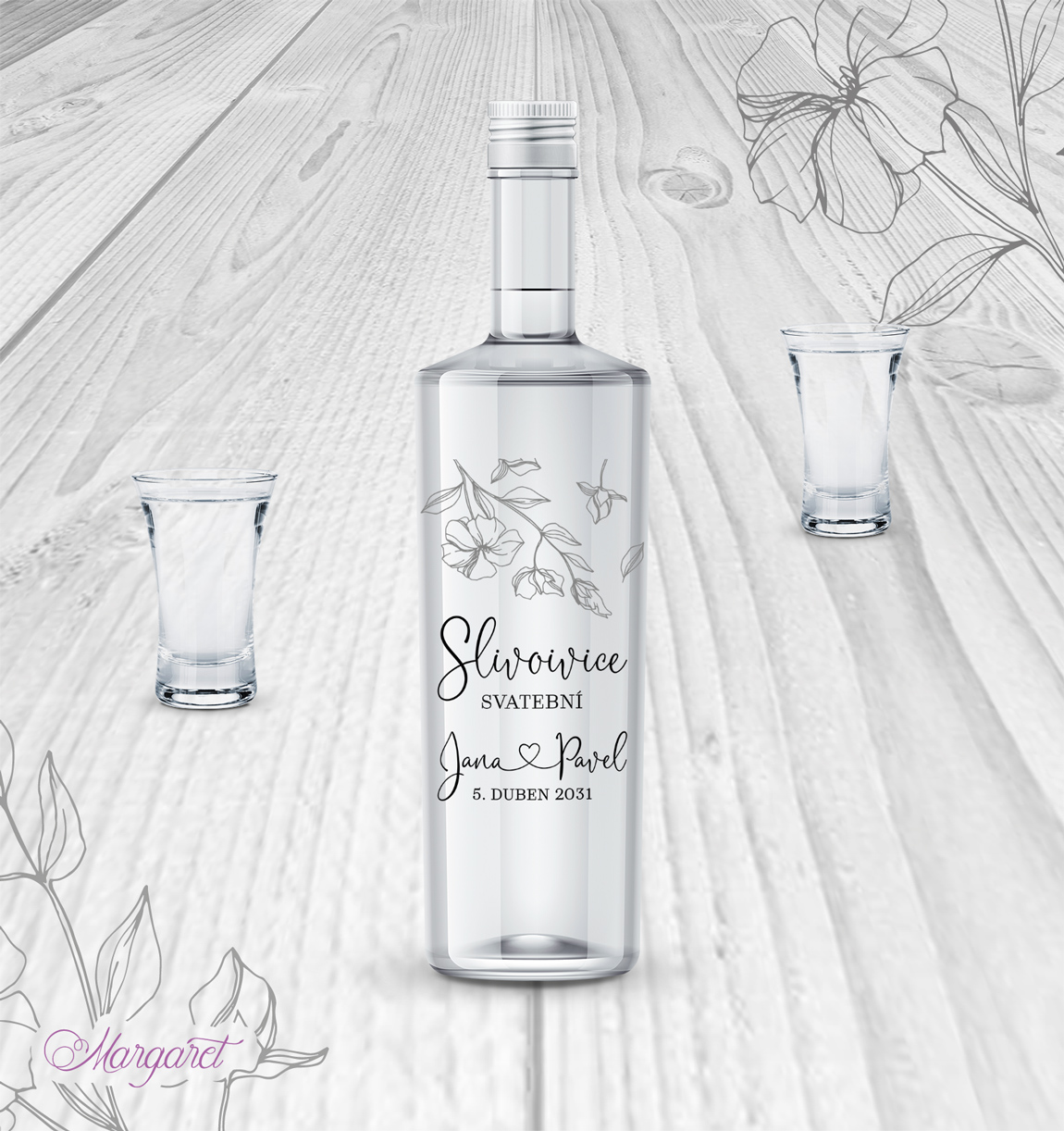 Luxusní průhledná etiketa na slivovici. Pálenka, kořalka nebo slivovice bývá nedílnou součástí svatby. Naše etikety jsou navržené, aby se hodily skvěle do stylu Vaší svatby, s Vašimi jmény a datem svatby.