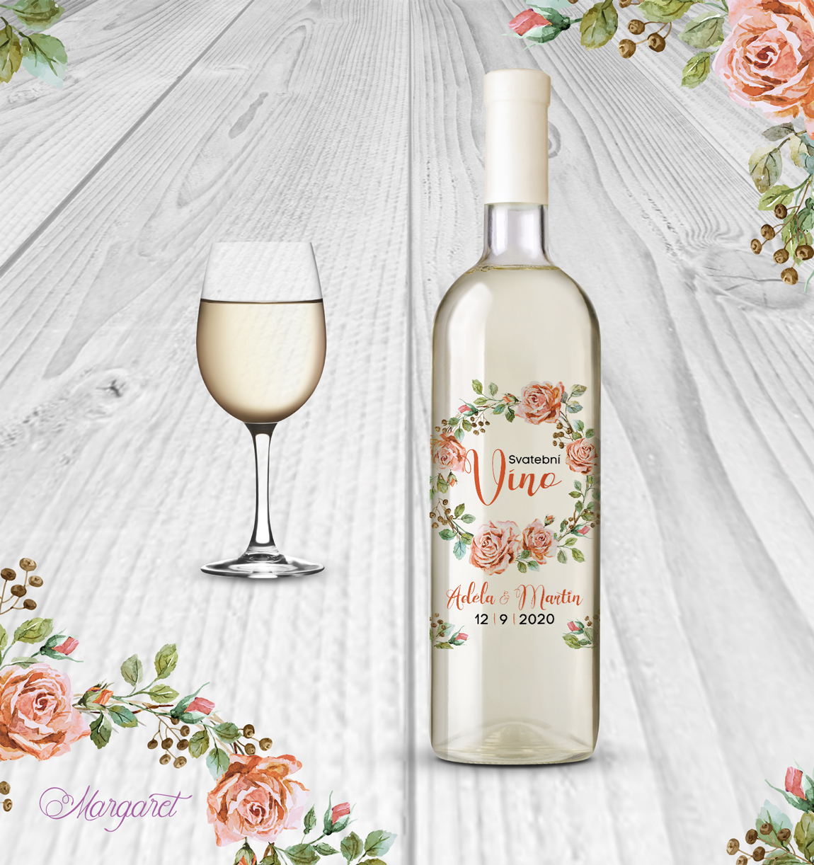 Luxusní průhledná etiketa na víno. Naše etikety jsou navržené, aby se hodily skvěle do stylu Vaší svatby, s Vašimi jmény a datem svatby.