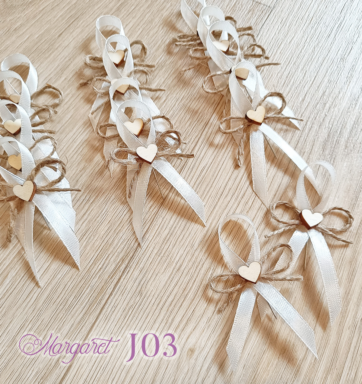 Elegantní stylové vývazky pro hosty a svatebčany. Svatební vývazek je vyrobený ze saténové stuhyv barvě Cream (krémová), dozdobený jutou a dřevěným srdíčkem.