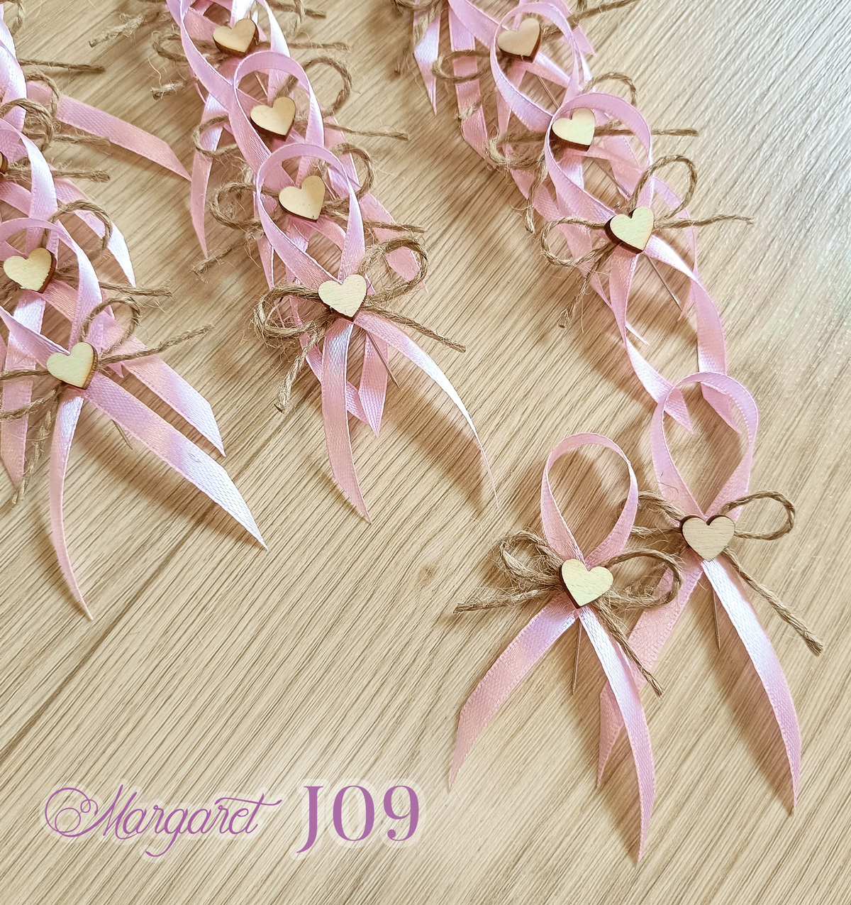 Elegantní stylové vývazky pro hosty a svatebčany. Svatební vývazek je vyrobený ze saténové stuhy v barvě Light Pink (světle růžová), dozdobený jutou a dřevěným srdíčkem.