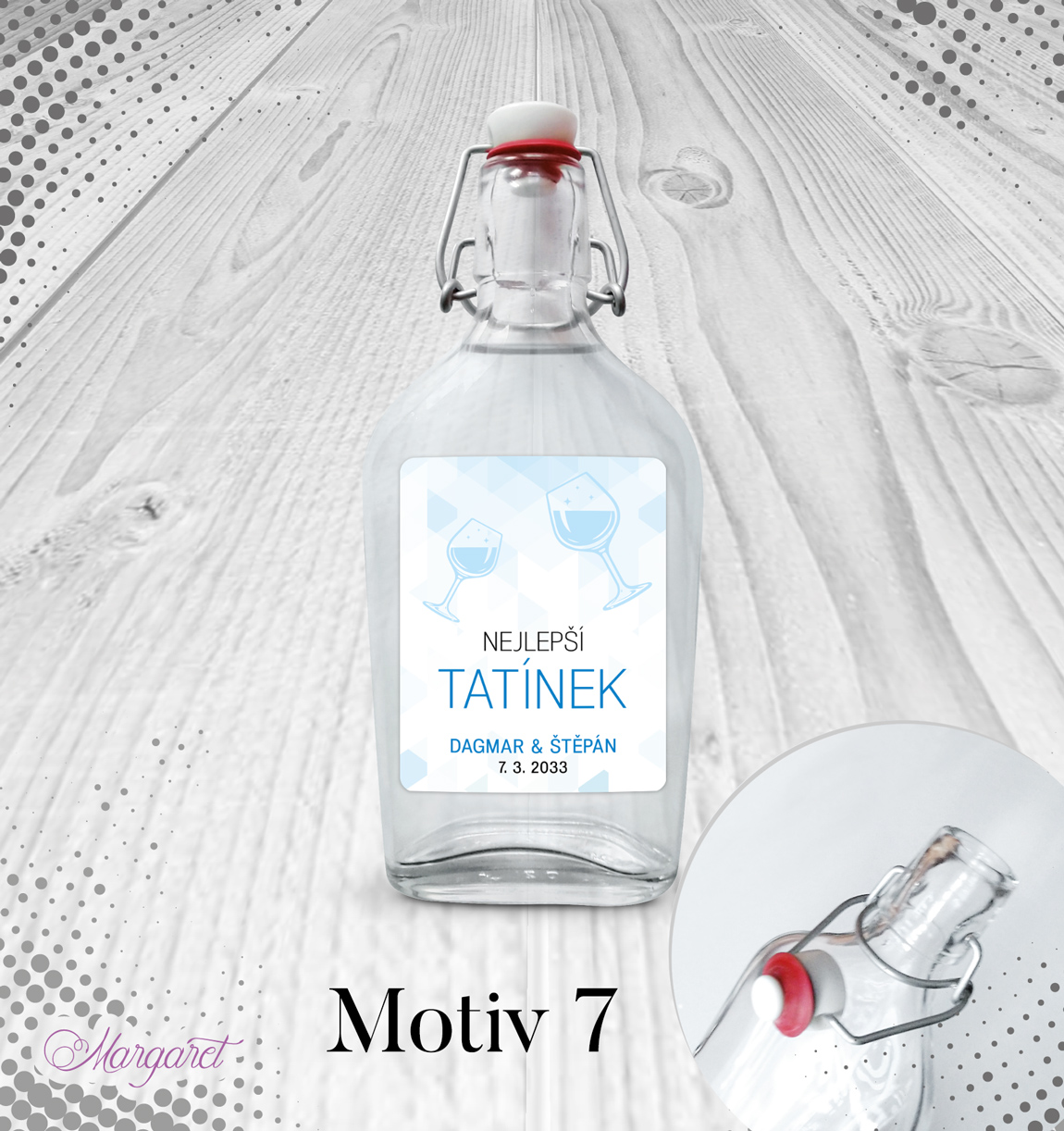Skleněná láhev s pákovým uzávěrem, etiketa na samolepícím papíře s vyšší gramáží. Po individuální domluvě je možné změnit text (např. Svědkovi, Bratrovi, Sestře, Mamince, atd.).