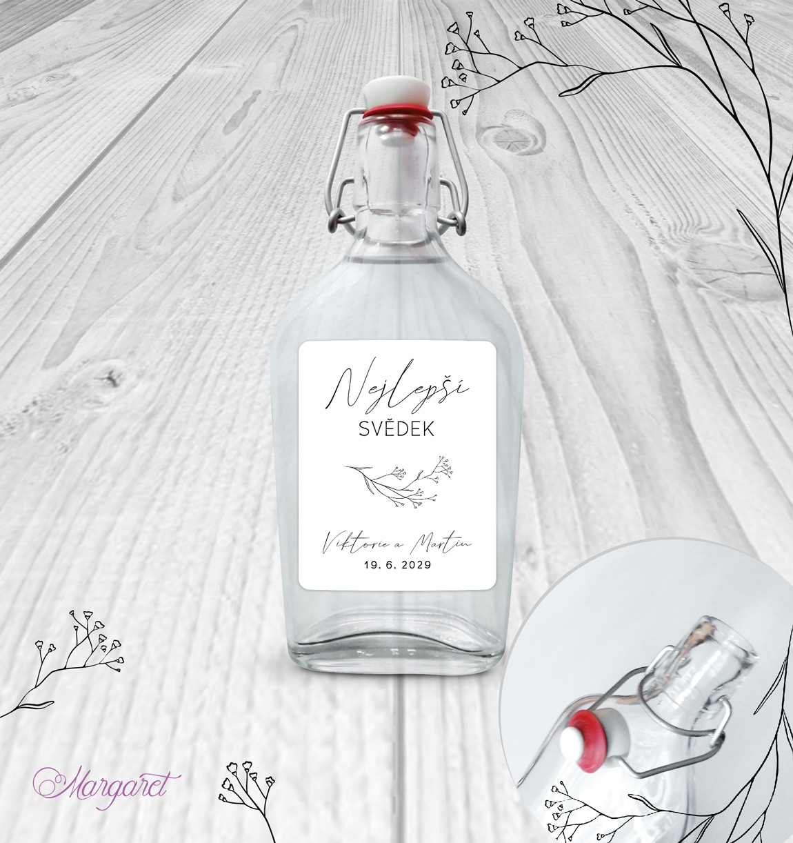Skleněná láhev s pákovým uzávěrem, etiketa na samolepícím papíře s vyšší gramáží.