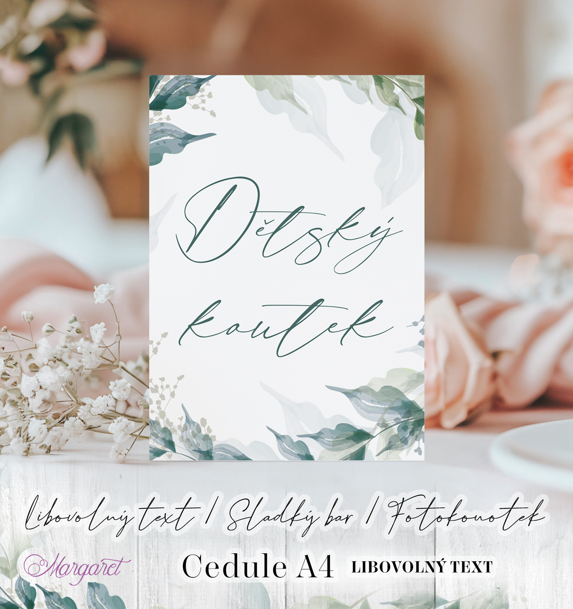 Tuto ceduli si můžete vybrat v designu jakékoliv svatební kolekce, kterou nabízíme na eshopu. Do poznámky v objednávce uveďte číslo svatební kolekce, do které chcete cedulku zpracovat. Poté Vám zašleme návrh ke schválení – tento návrh je ZDARMA.