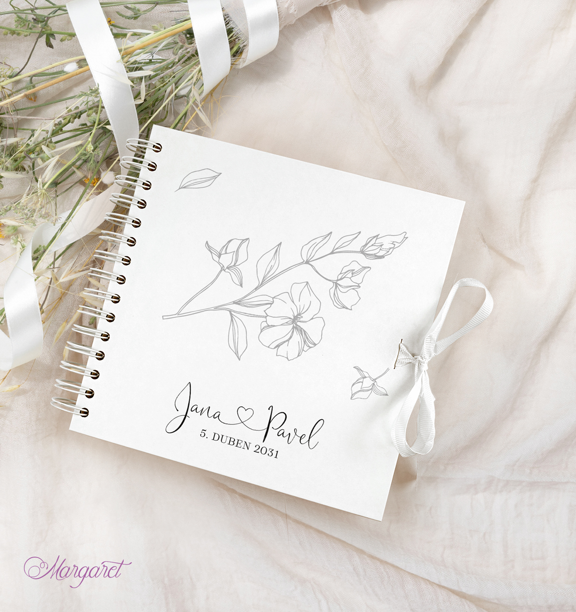 • Obálka – bílá, tvrdé knižní desky, se jmény novomanželů a datem svatby
