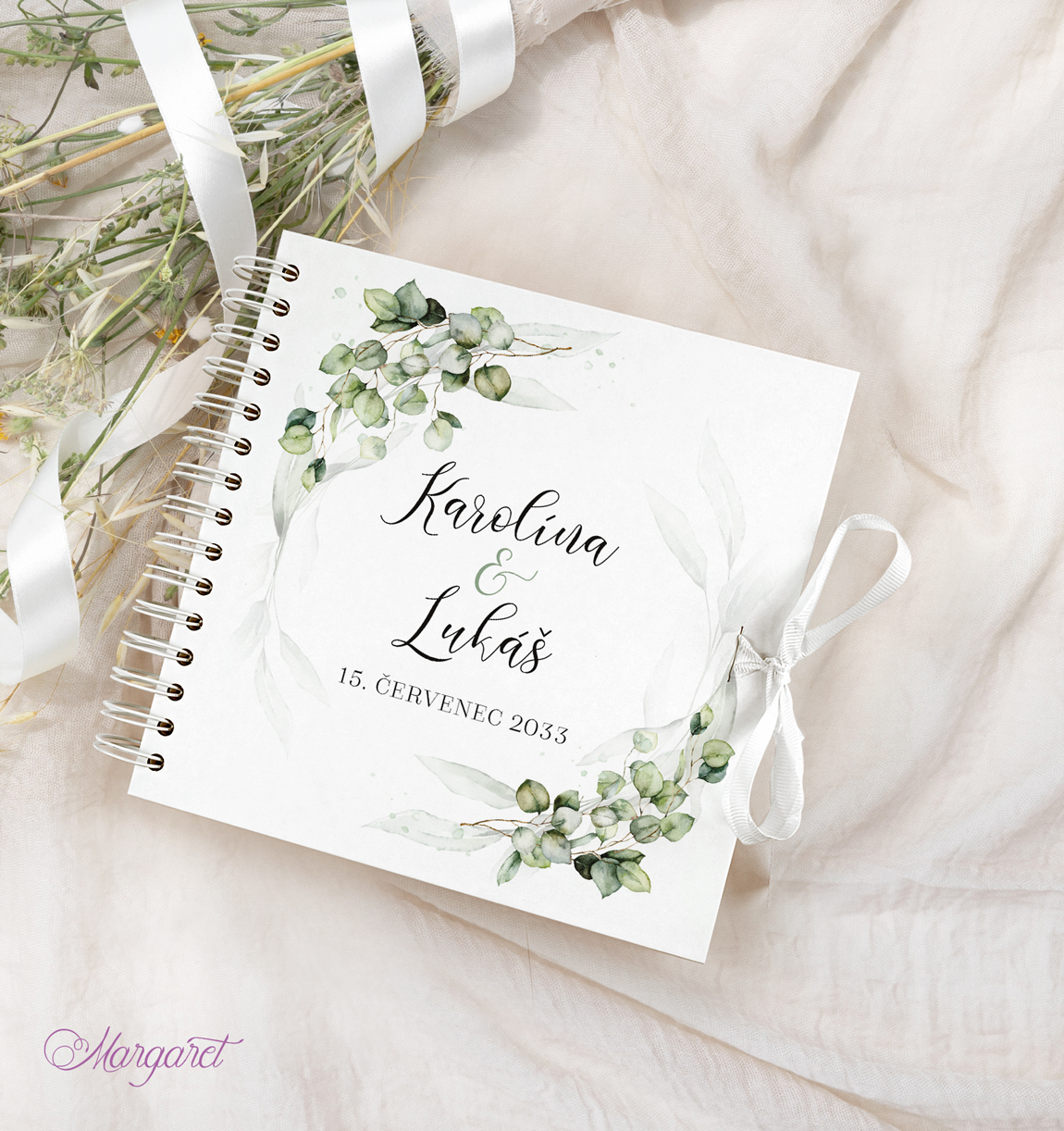 • Obálka – bílá, tvrdé knižní desky, se jmény novomanželů a datem svatby