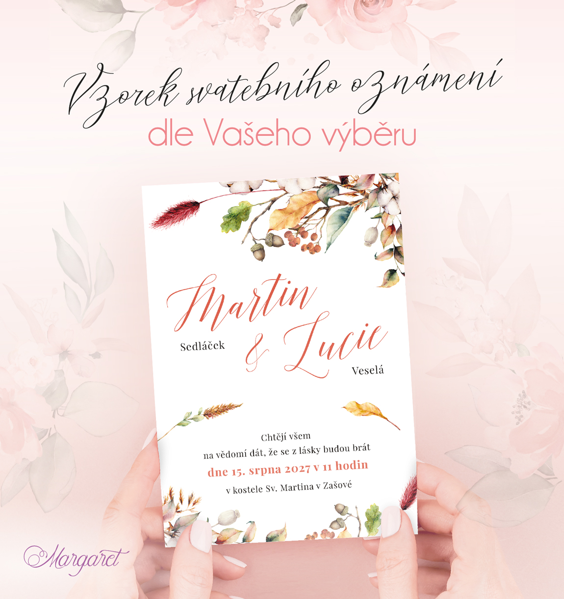 • 3x vzorek svatebního oznámení dle vašeho výběru (výběr kolekce svatebního oznámení upřesněte do poznámky v objednávce, pokud nebude upřesněn, vzorky vám vybereme)