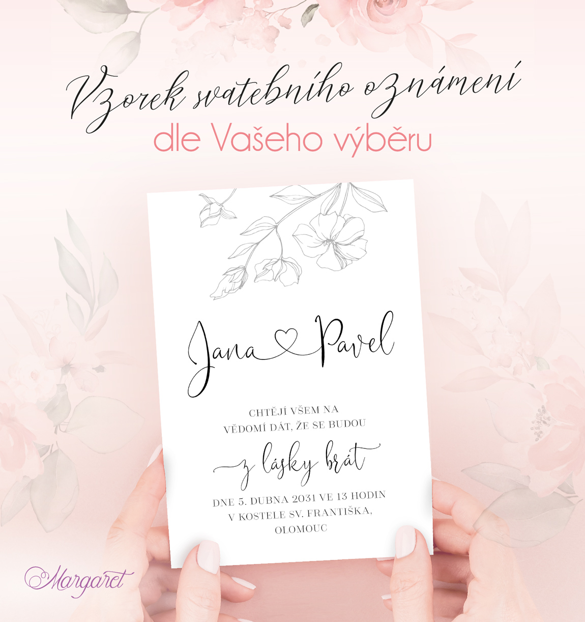 • 3x vzorek svatebního oznámení dle vašeho výběru (výběr kolekce svatebního oznámení upřesněte do poznámky v objednávce, pokud nebude upřesněn, vzorky vám vybereme)