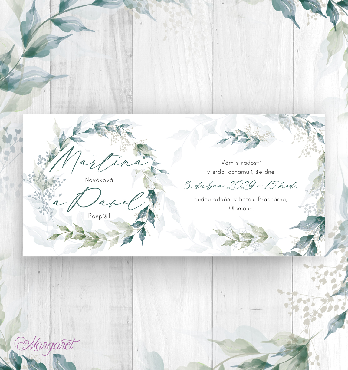 Krásné svatební oznámení ve stylu svatební kolekce, s Vašimi jmény, datem svatby a texty.