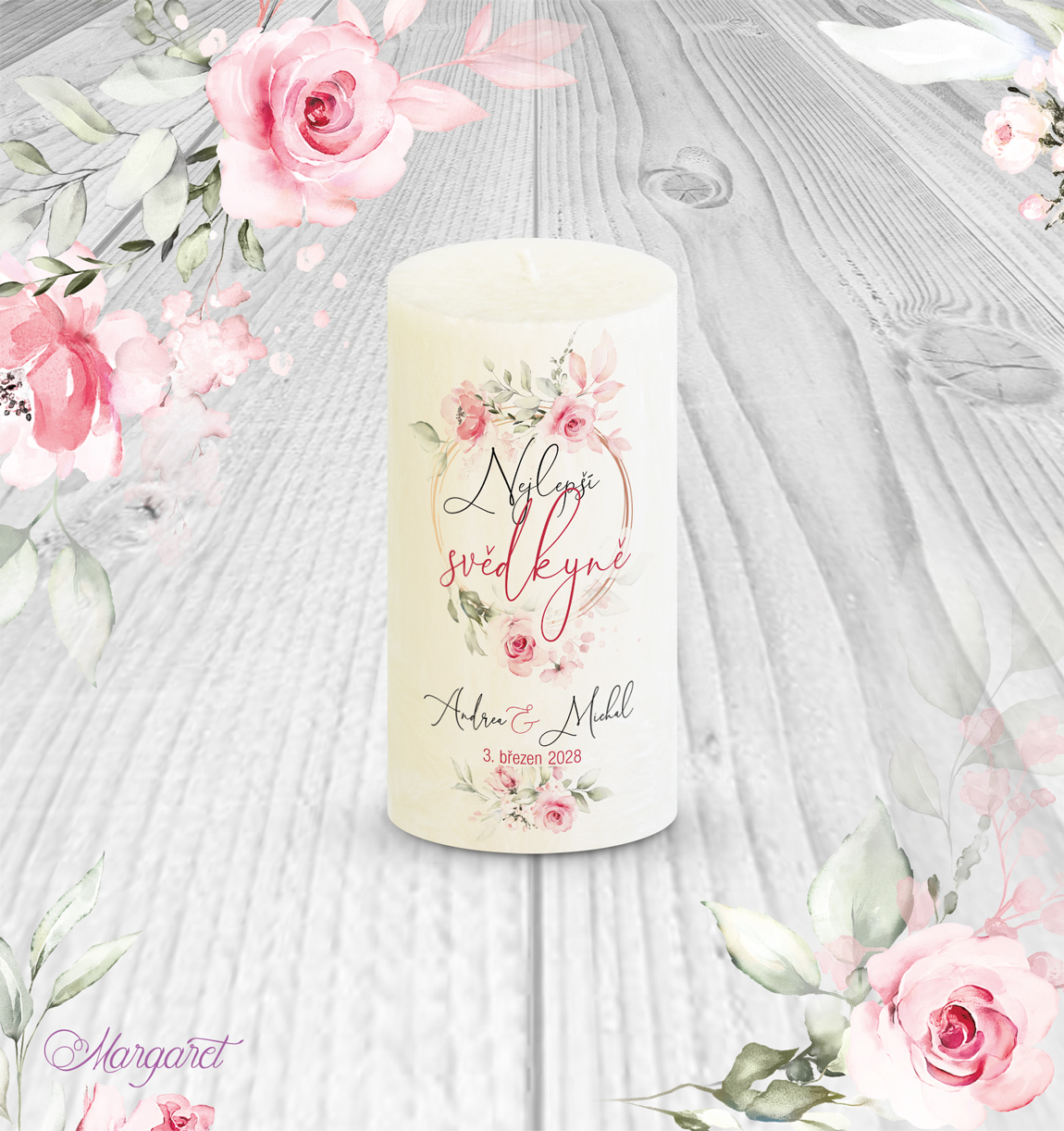 Nabízíme originální dárek pro svědkyni nebo svědka. Na svíčce jsou uvedeny vaše jména i datum svatby, takže se jedná o krásný dáreček.