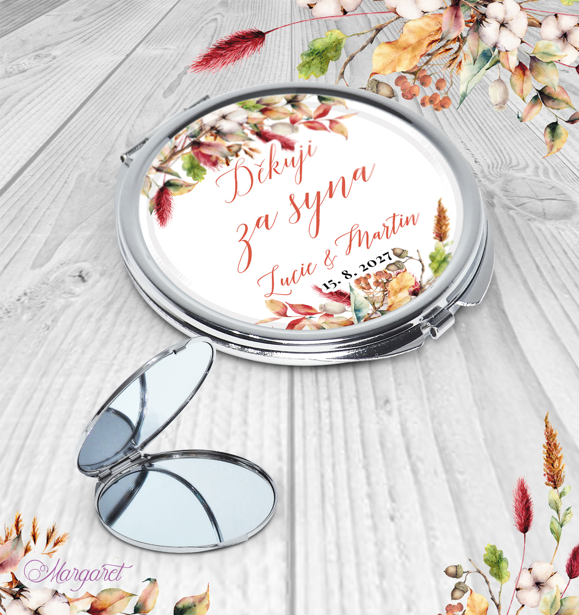 Zrcátko je otevírací, obsahuje 2 zrcátka – jedno zvětšující, jedno obyčejné. Po individuální domluvě je možné změnit text.