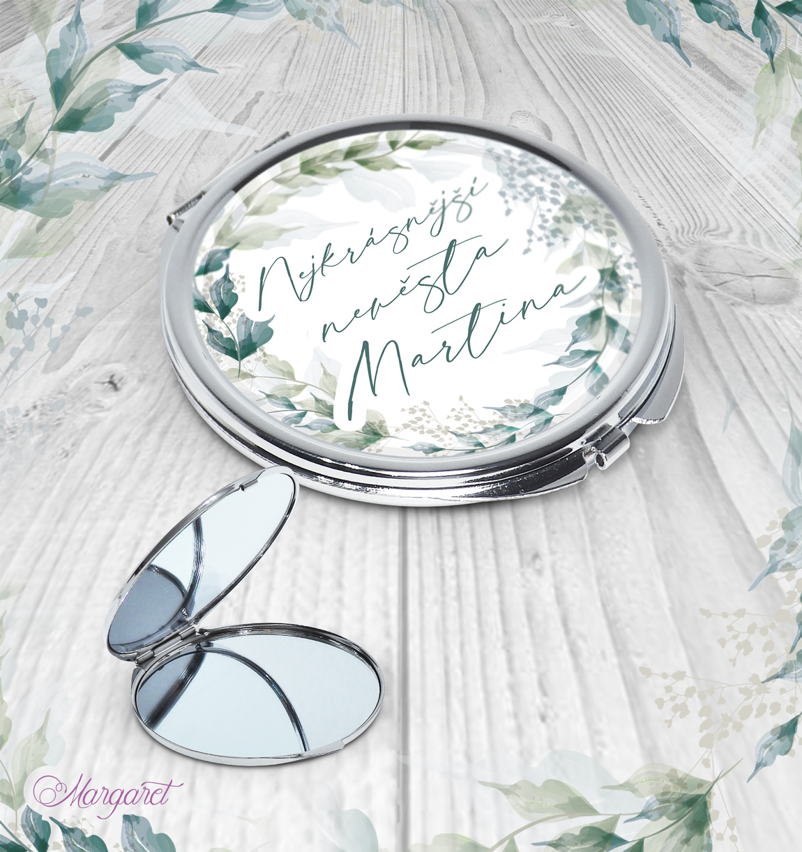Zrcátko je otevírací, obsahuje 2 zrcátka – jedno zvětšující, jedno obyčejné. Po individuální domluvě je možné změnit text.