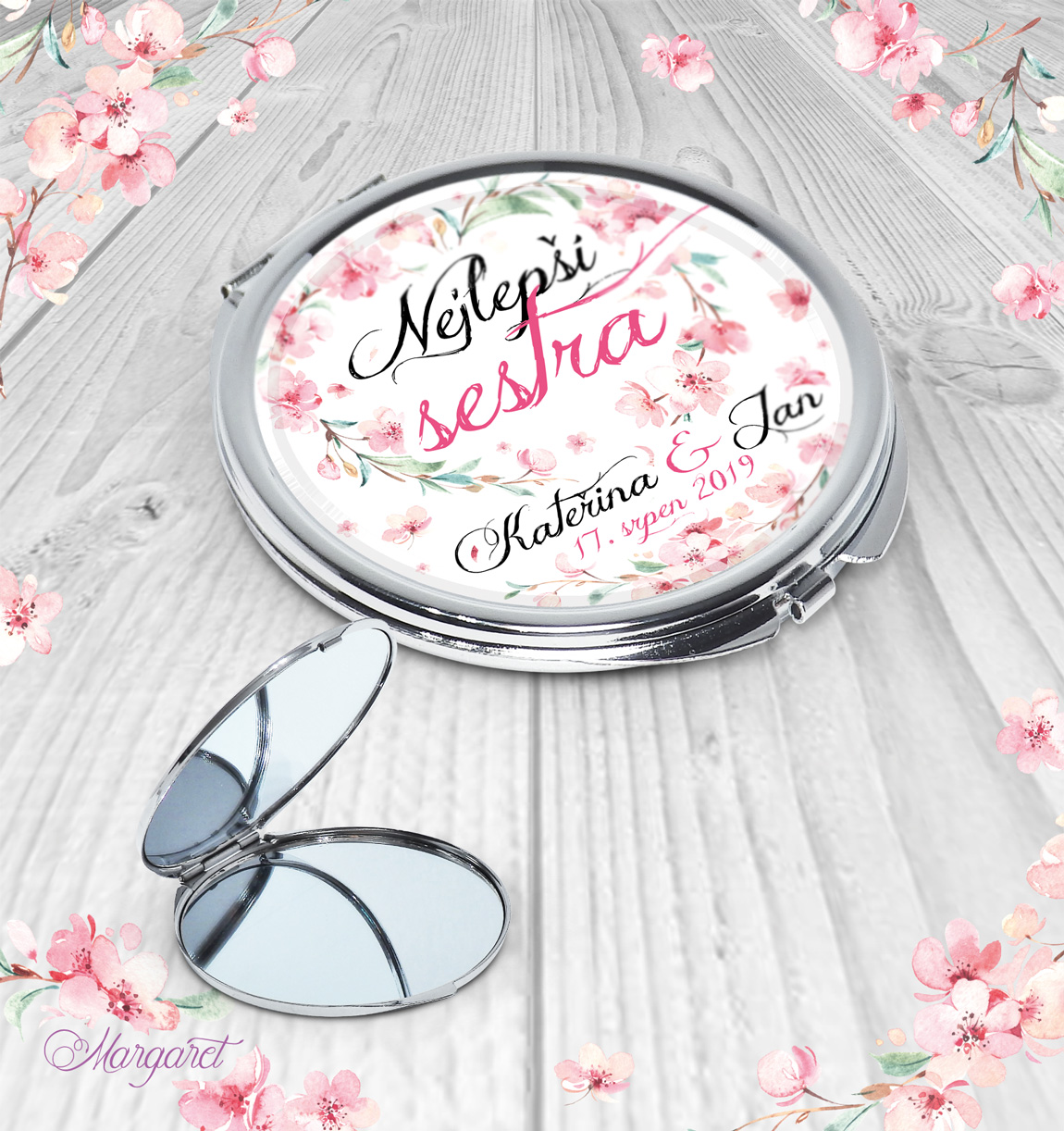 Zrcátko je otevírací, obsahuje 2 zrcátka – jedno zvětšující, jedno obyčejné. Po individuální domluvě je možné změnit text.